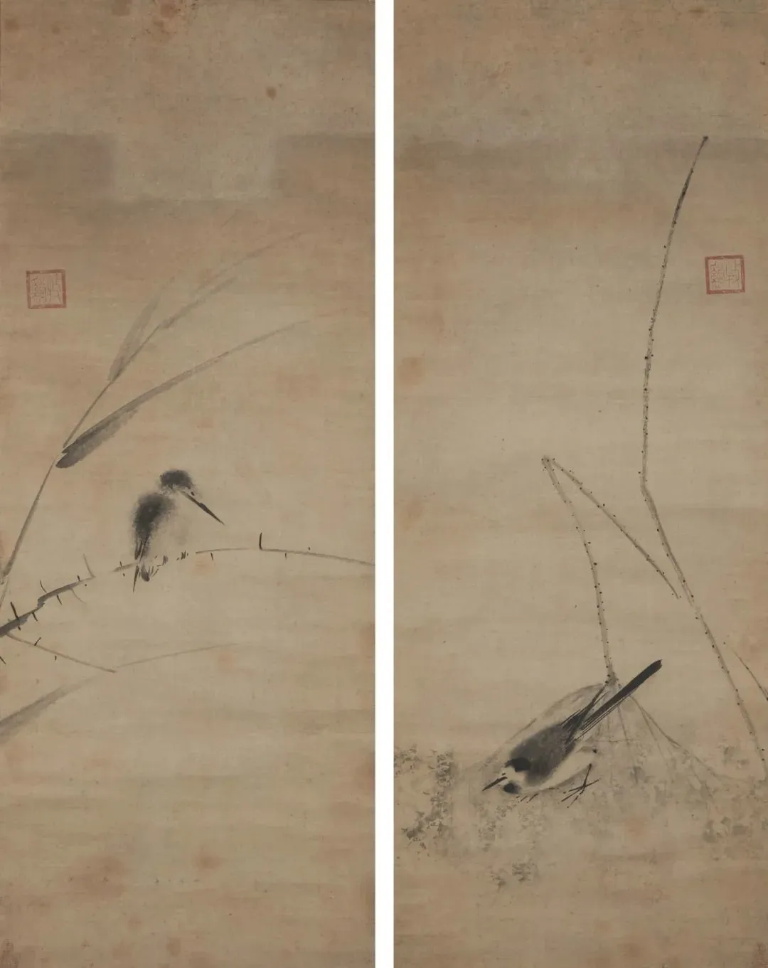 牧溪 鹡鸰翡翠对幅